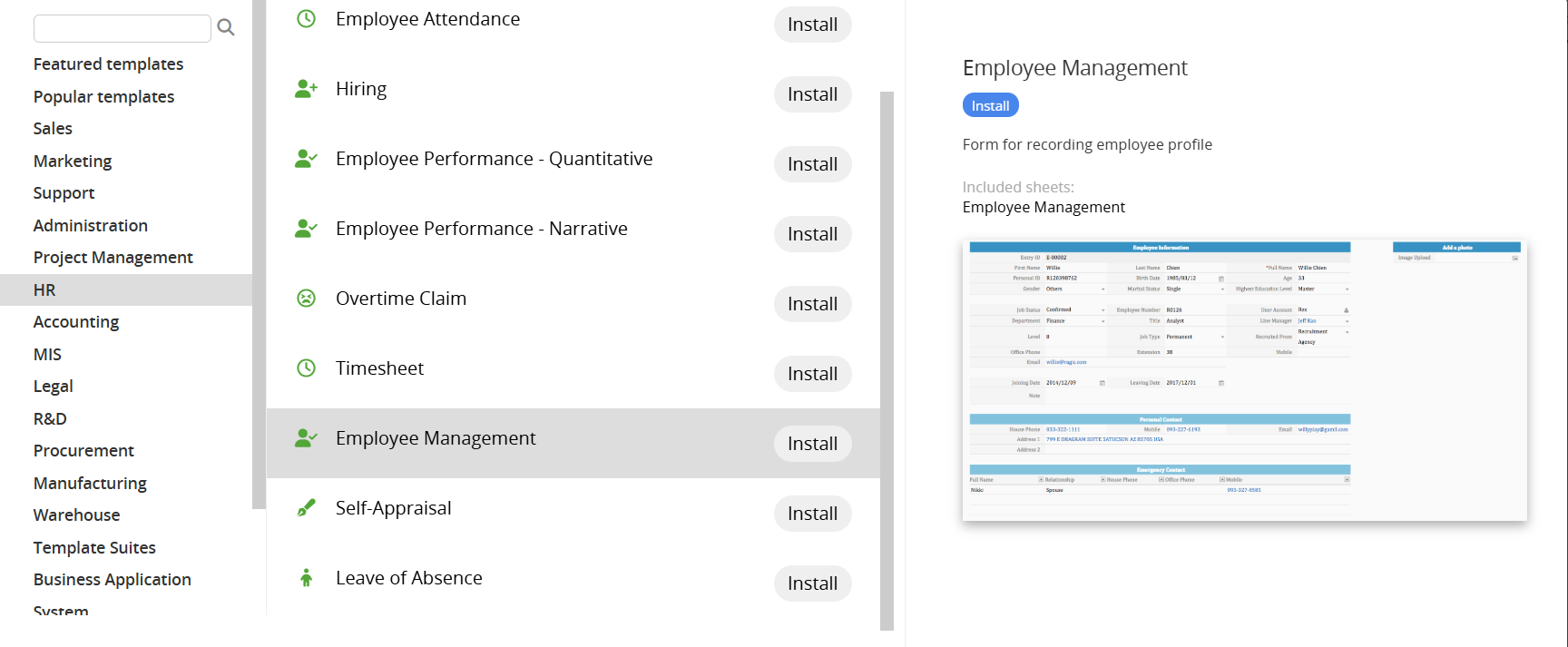 If you are already a Ragic user, you can find the "Employee Management", "Timesheet", "Overtime Claim", and "Leave of Absence" templates under the "HR" category in Install Templates and click Install to download them.