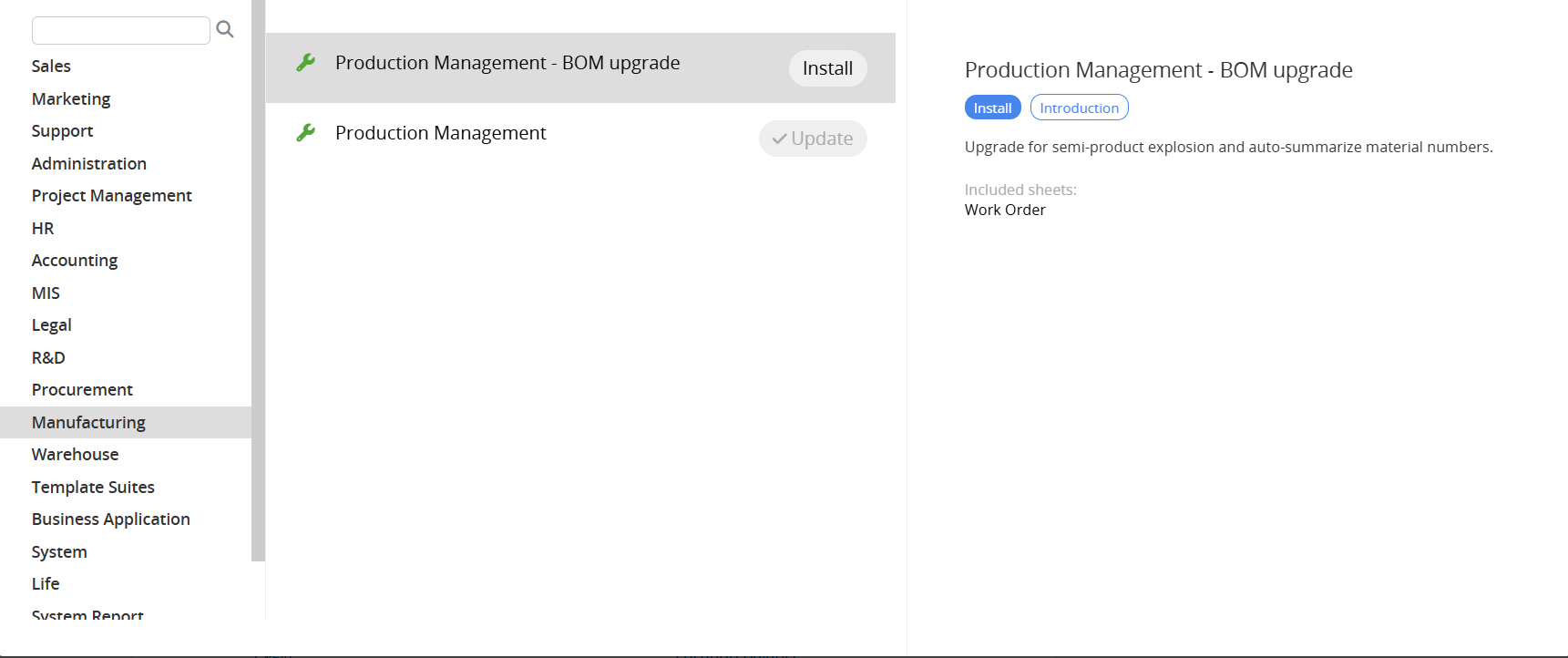 From December 11, 2023, our "Production Management" template supports a "Semi-product" explosion button and will summarize the material numbers automatically. For users who have installed the template before, please access install templates and download the "Production Management - BOM upgrade" template to update your "Work Order" sheet.