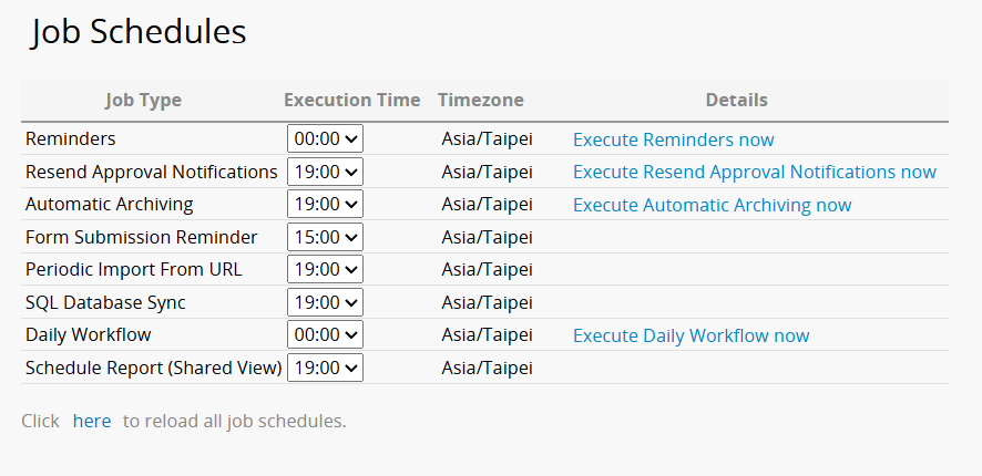 You can set the job execution time for the features below: Reminder, Resend Approval Notifications, Automatic Archiving, Form Submission Reminder. Periodic Import from URL, SQL Database Sync, Daily Workflow, and Schedule Report. The job execution time in your account will usually be the default job schedule execution time that's set up according to your Account Settings. However, you can still configure a different execution time for each job. Please note that the settings of each feature should be modified in the corresponding interface of that feature.