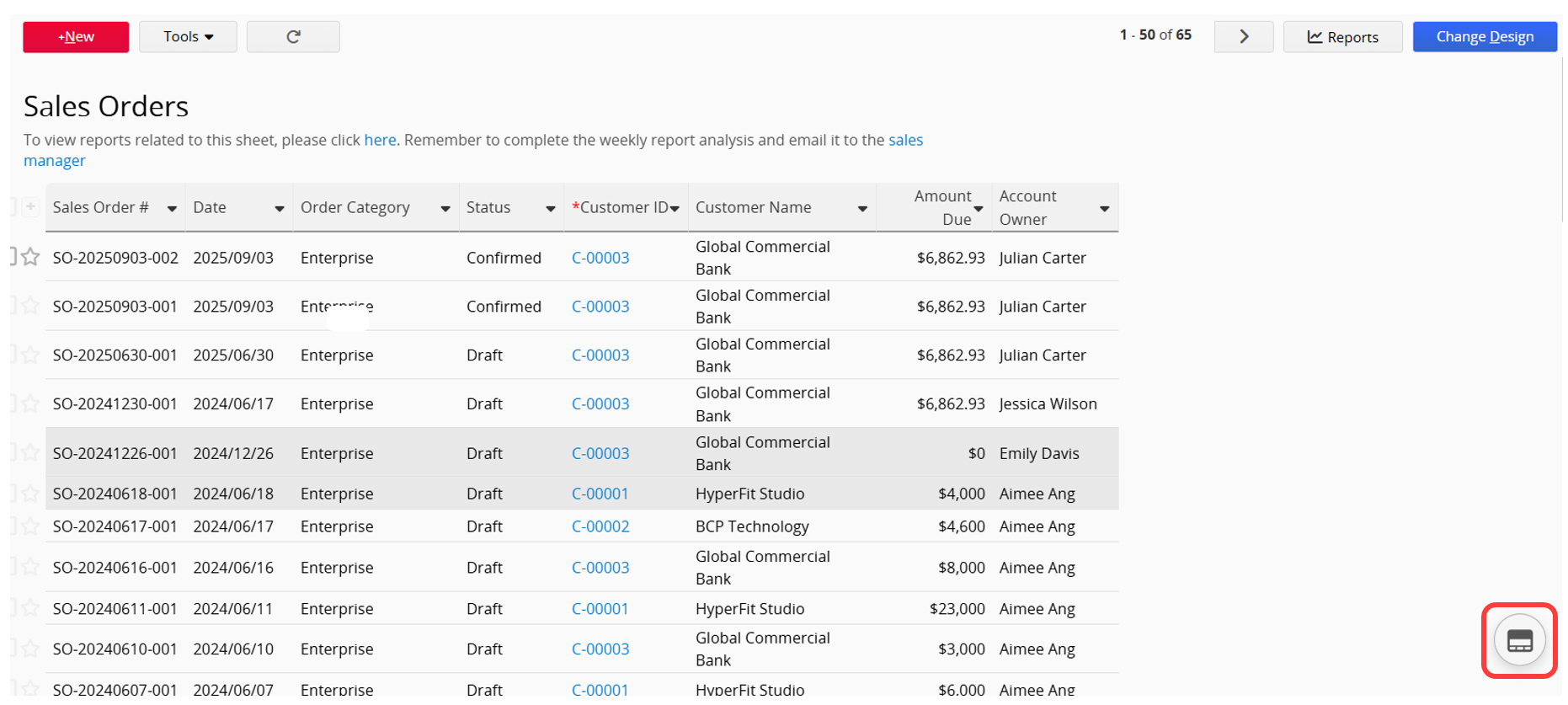 | Apply all formulas in the sheet to all saved records: This will recalculate the formulas for all records visible to the user, including records that cannot be edited. Please ensure whether the button should be made available to regular users (Internal Users only). |