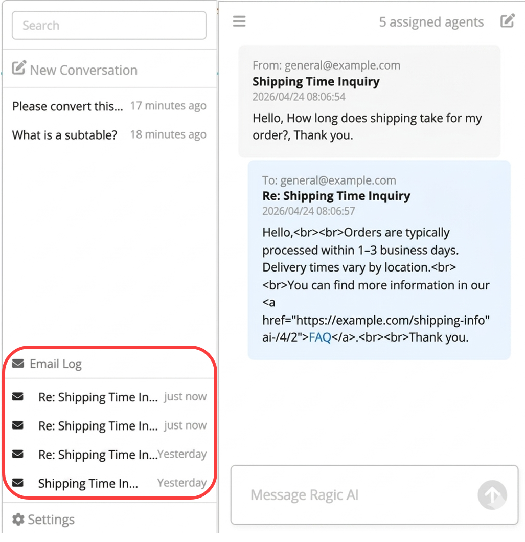 When assigning an AI Agent to automatically reply to emails, you can view the send and receive logs for its dedicated email address (for example, example@ragic.ai) here.