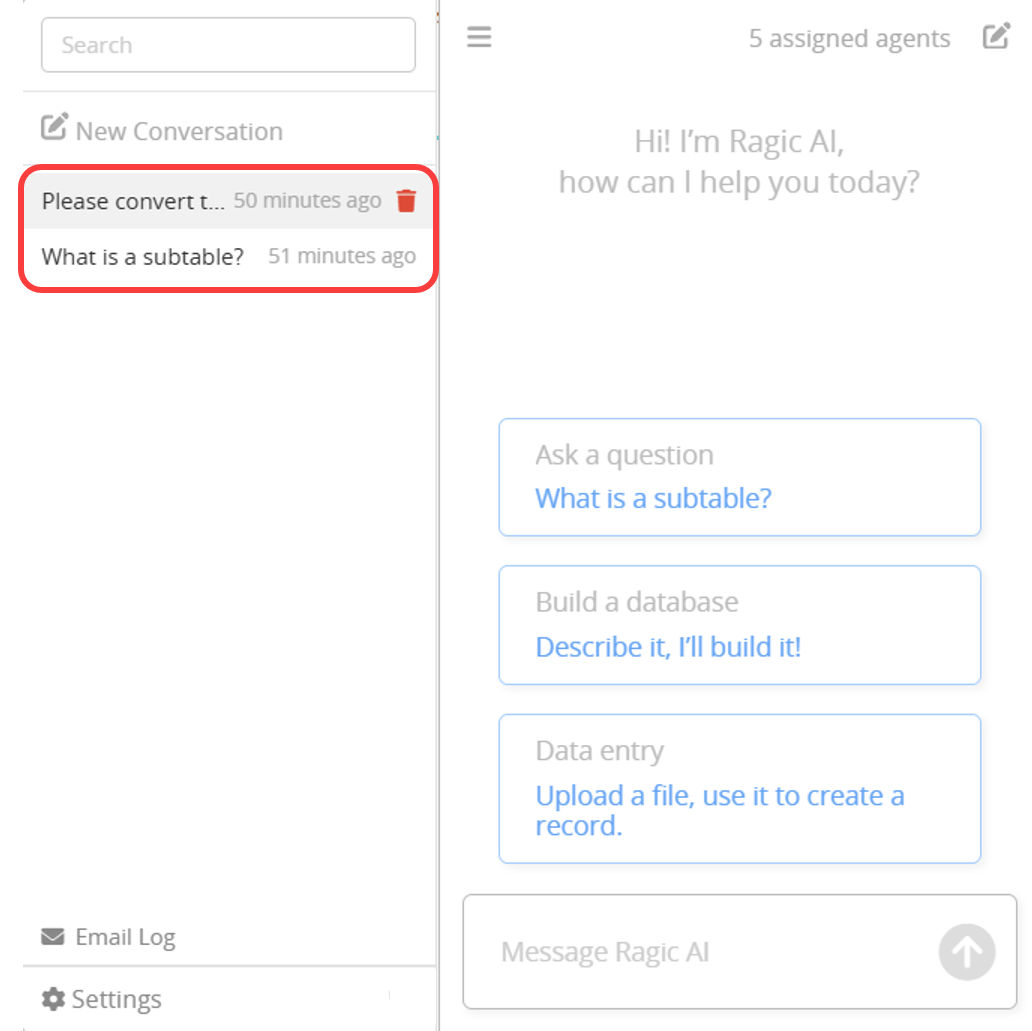 Click the top left menu to view or search your conversation history. Each conversation is automatically named based on its content, and you can delete it using the trash icon on the right.