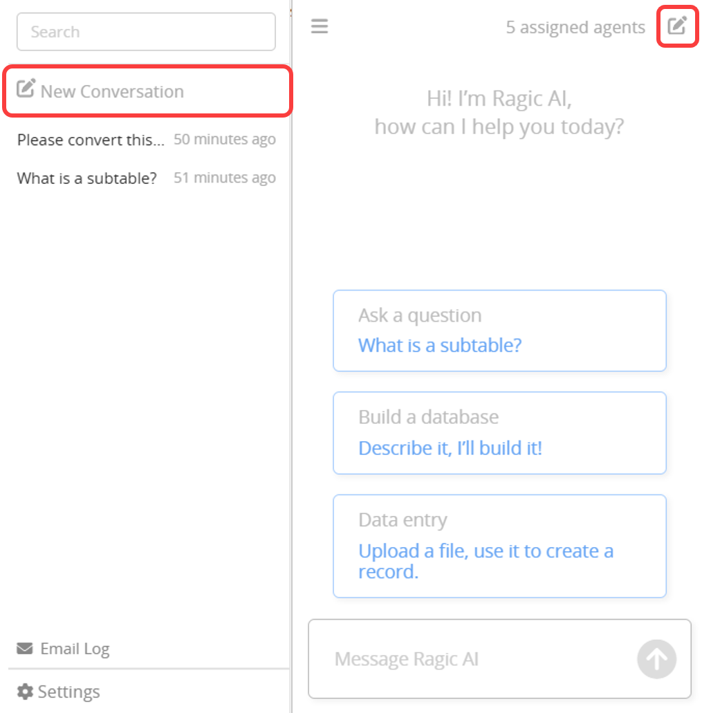 To start a new conversation, you can click the icon in the top right corner or open the menu and select New Conversation.