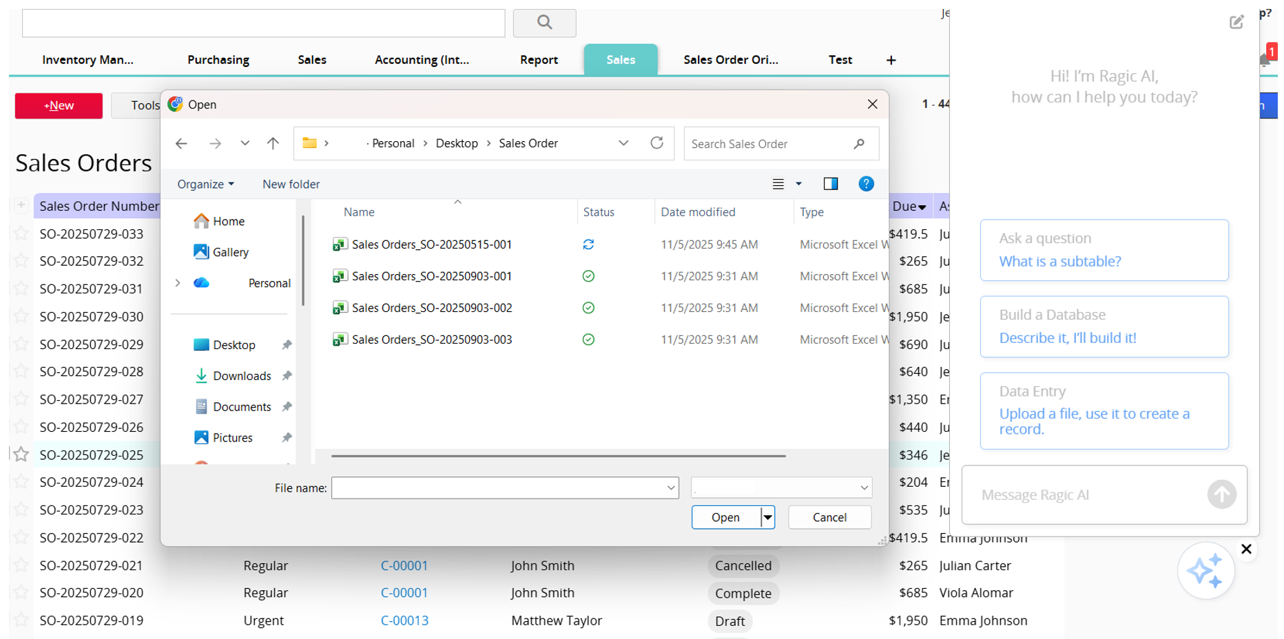 Simply upload a file, and Ragic AI will automatically read its content and populate the corresponding fields to help you quickly create a new record. For instance, uploading an order in PDF format allows the system to automatically create a sales order, streamlining operations and minimizing manual input.