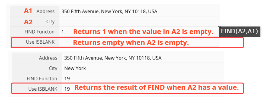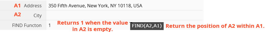 For example, if the value in the "City" field (A2) is empty, FIND(A2, A1) returns 1 when searching within the "Address" field (A1).