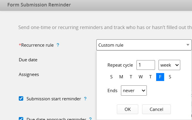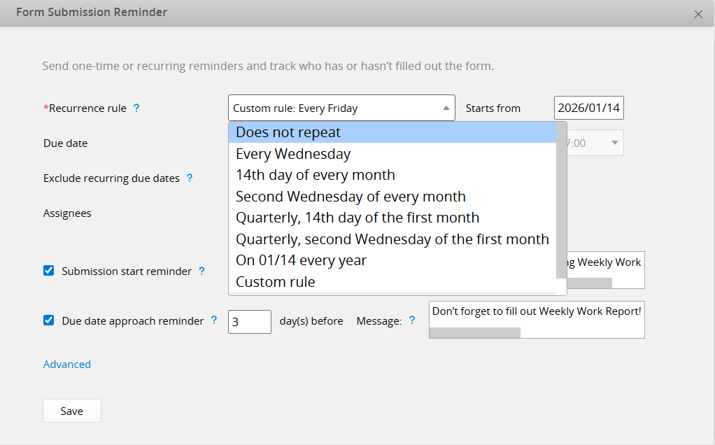 When creating a Custom rule, you can define the repeat cycle, select specific weekdays, and choose how the recurrence ends. For example, you can set a reminder to submit a "Weekly Work Report" every Friday.