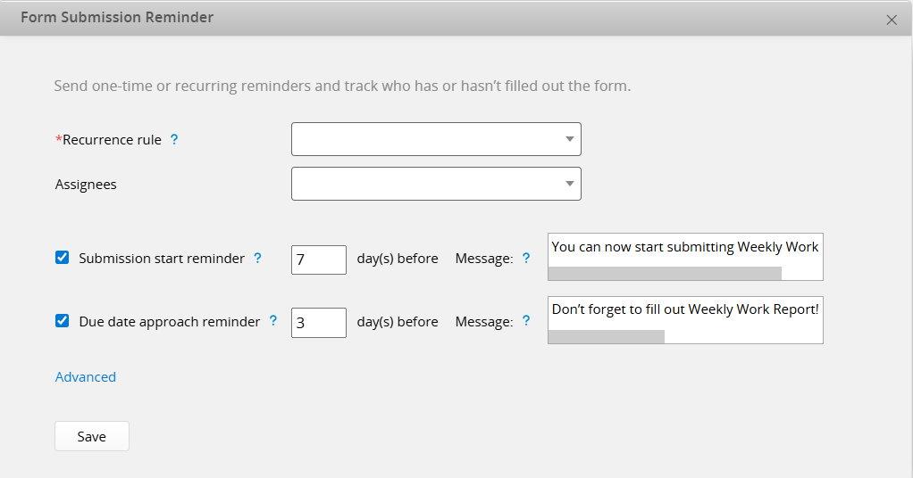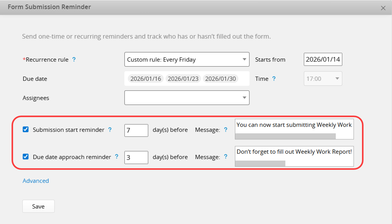 You can set up the Form Submission Reminder to prompt users to complete a sheet regularly or as a one-time task, such as quarterly objectives, weekly work reports, or event registration forms. The system automatically sends reminders based on the configured due dates and recurrence rules, and tracks each user’s submission status.