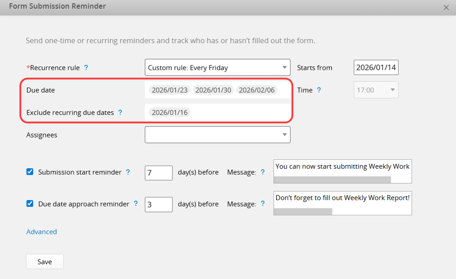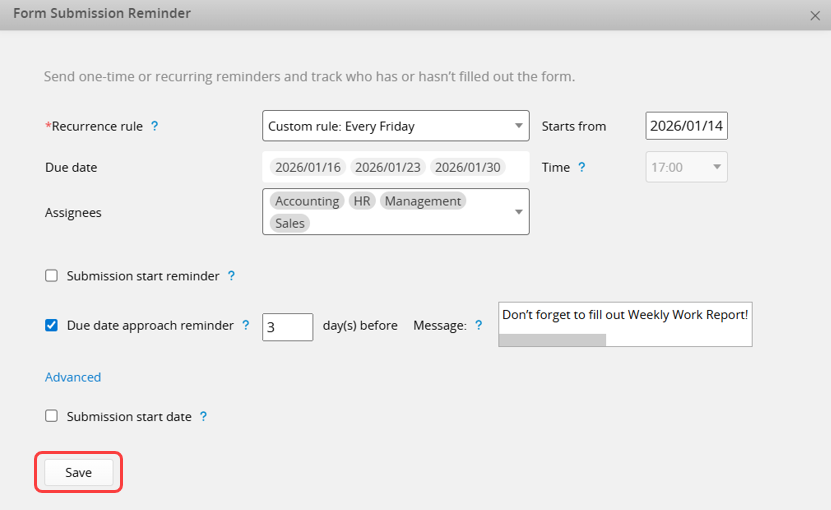 After completing the configuration, click Save. If there is a due date whose reminder period has already started, the system will send notifications immediately.