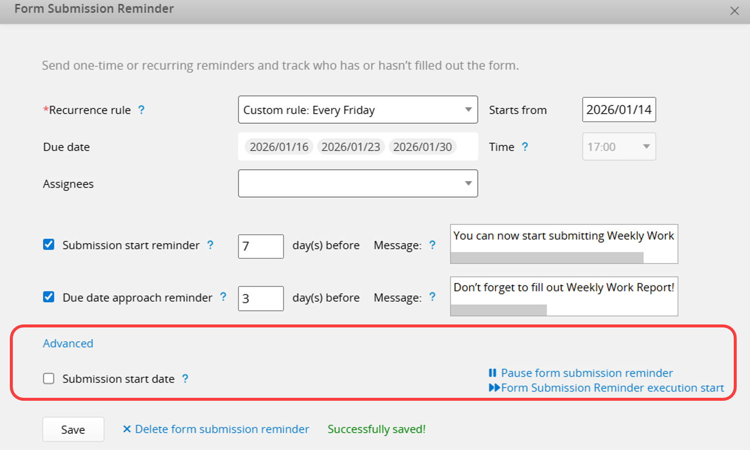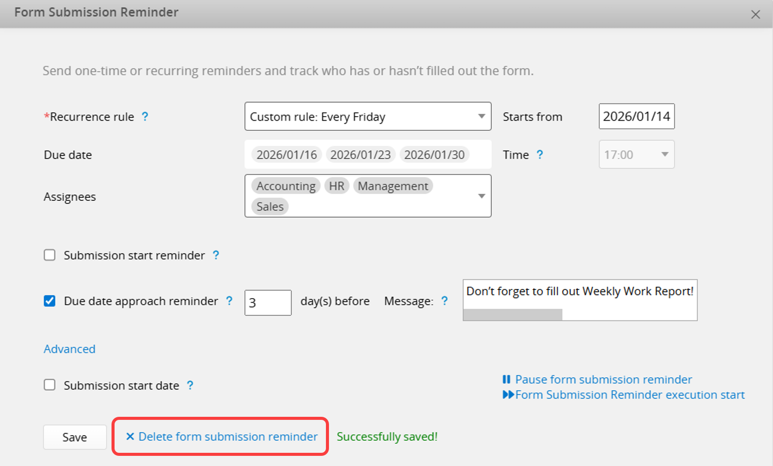 After saving the reminder, open Advanced to pause the reminder or start the Form Submission Reminder.