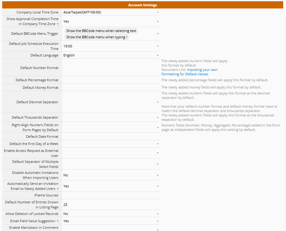 Default Job Schedule Execution Time: The default execution time (system default is 19:00 based on the Company Local Time Zone) for the features below: Reminder, Daily Workflow, Periodic Import from URL, Schedule Report, and Automatic Archiving. To set different execution times for each feature, please adjust the settings in Job Schedules.