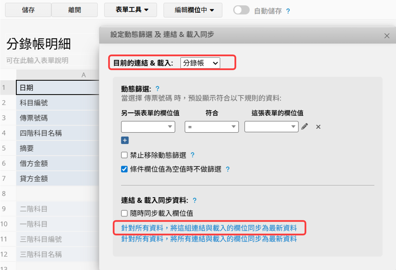 2. “分录帐明细”表单请与“分录帐”表单运行针对所有数据,将这组链接与加载的字段同步为最新纪录。