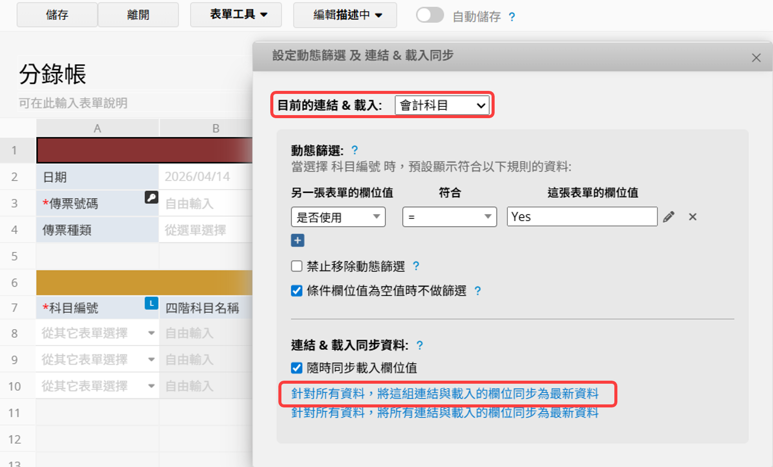 1. “分录帐”表单请与“会计科目”表单运行针对所有数据,将这组链接与加载的字段同步为最新纪录。