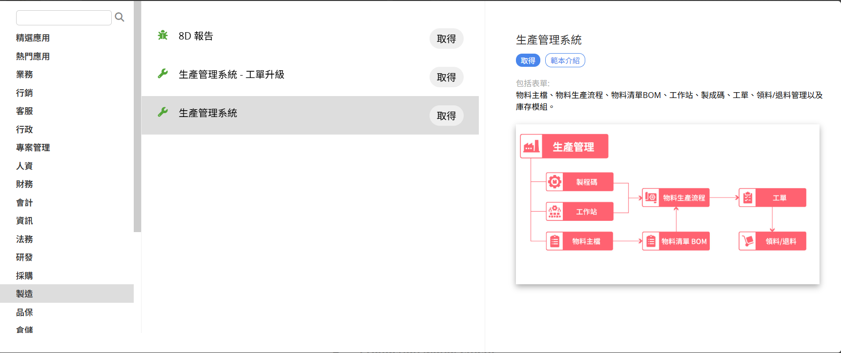 若已经是 Ragic 订户,可以在应用商店的“制造”类别中找到“生产管理系统”模块并点击“获取”来下载。