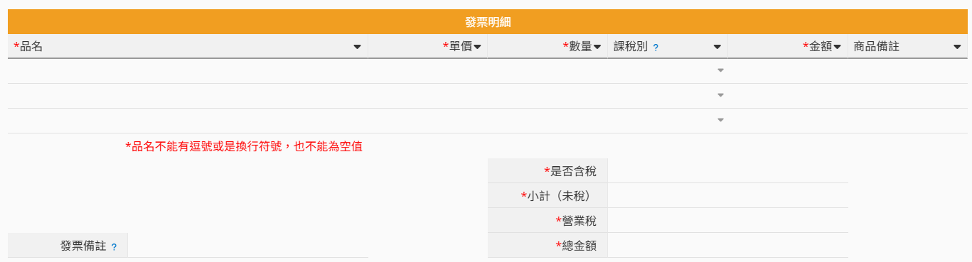 “品名”字段中不能包含有逗号或是换行符号,也不能为空值,否则会导致发票无法顺利开立,还请特别留意!