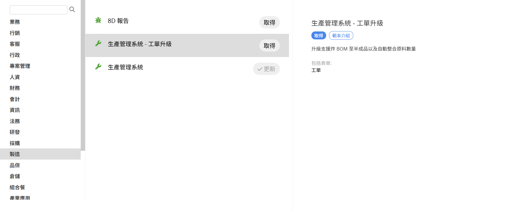 “生产管理”模块至 2023/12/11 起正式支持“炸 BOM 至半成品”以及“炸 BOM 后自动集成物料数量”的功能!针对原本曾经安装过“生产管理”模块的用户,可以至应用商店,点击“生产管理系统 - 工单升级”进行升级。