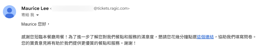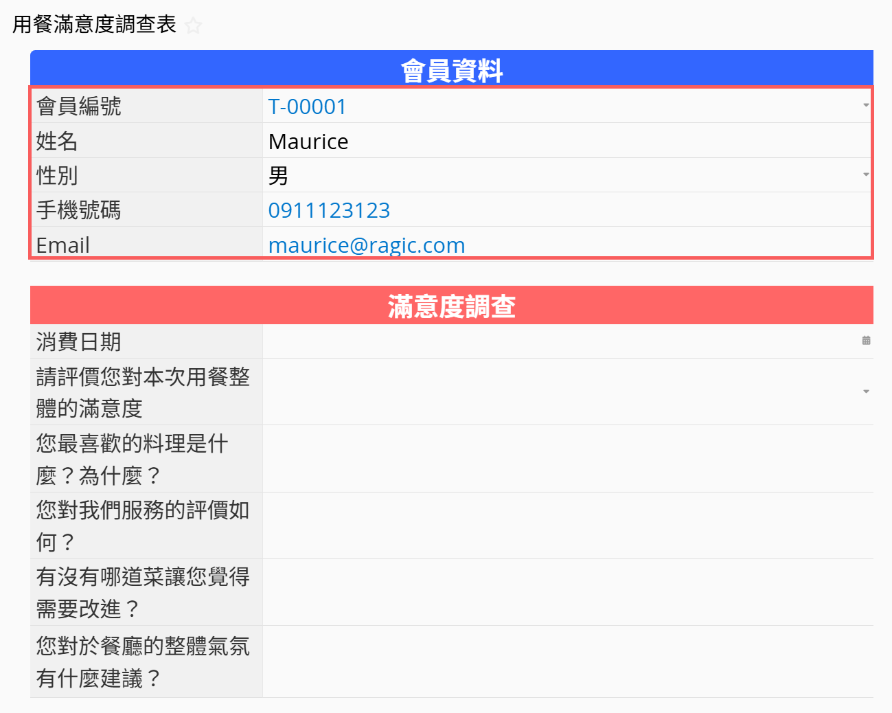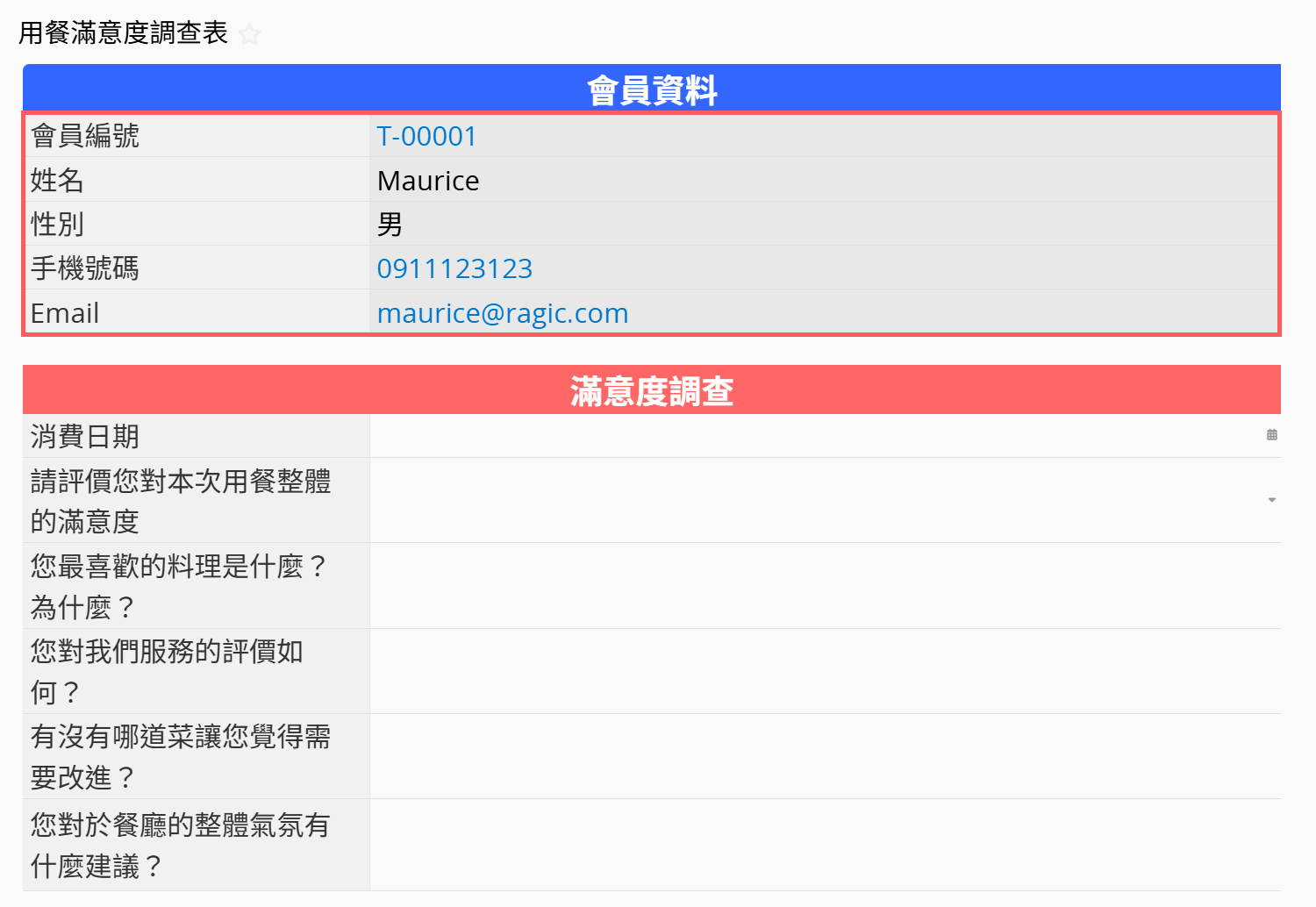 (4) 会员打开链接时,会看到表单上的基本数据已预填,他们只需依序回答下方的满意度问题即可。