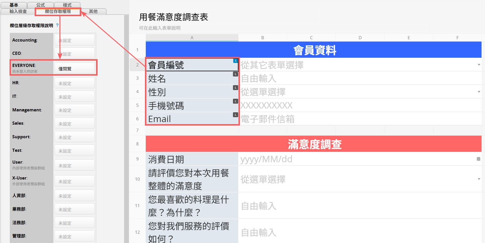 (2) 为避免预填好的会员数据被误改,将上方的会员数据字段的字段访问权限,其中 Everyone 的权限调整为“仅阅览”。