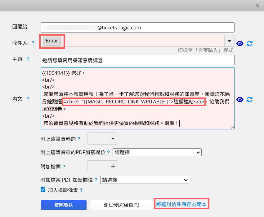 (3) 在列表页中,用发送 E-mail 的功能将调查表来寄送给会员。将收件人设为“Email”,主题和内文可依需求使用自订 E-mail 范本变量来设置,在信件中加入可修改数据的 magic link: