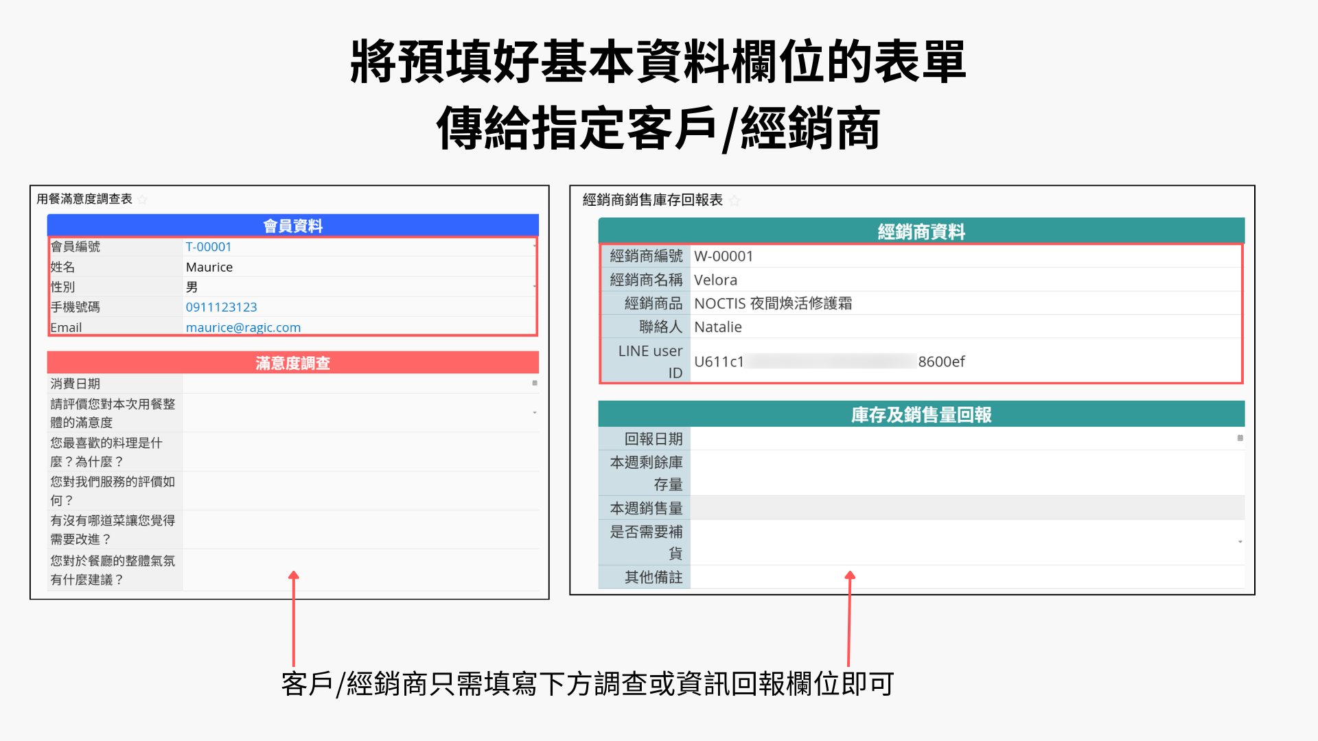 在 Ragic 里,你可以透过 Email 或 LINE 发送这种“预填好字段的专属表单链接”给不同对象填写。本篇文章会分别演示如何用 Email 寄出预填的调查表给餐厅会员,以及如何透过 LINE 一键传送预填表单给经销商。