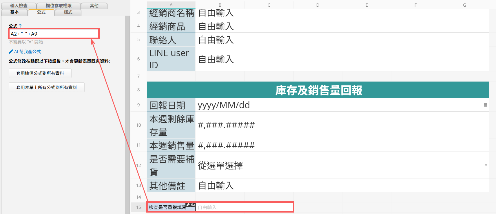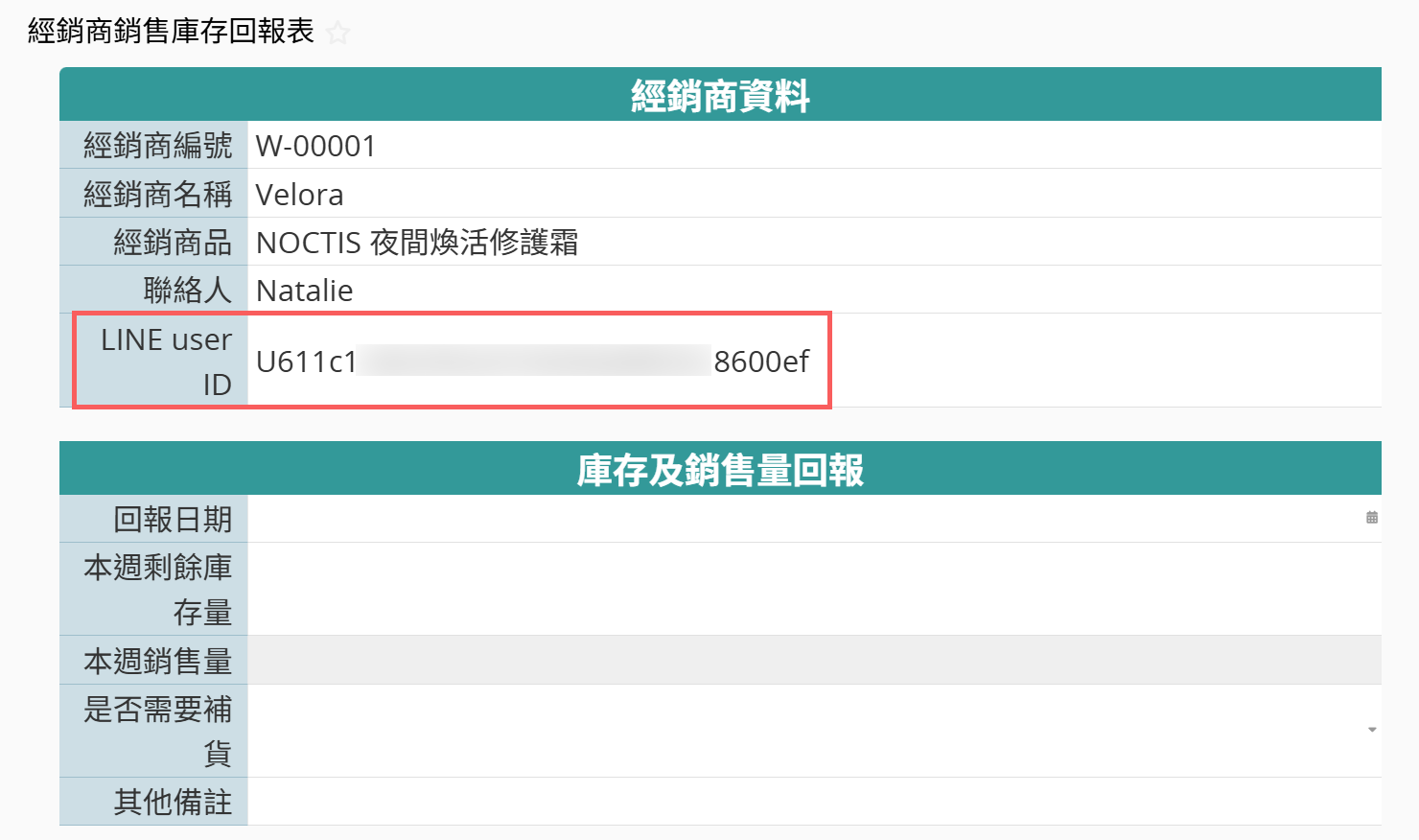 (1) 首先,创建一张“经销商销售库存回报表”。因为要让系统知道该把信息传给哪个 LINE 帐号,因此要在表单中加入一个 LINE user ID 字段。(你可以参阅这篇文章的教学,了解如何获取客户的 LINE user ID)