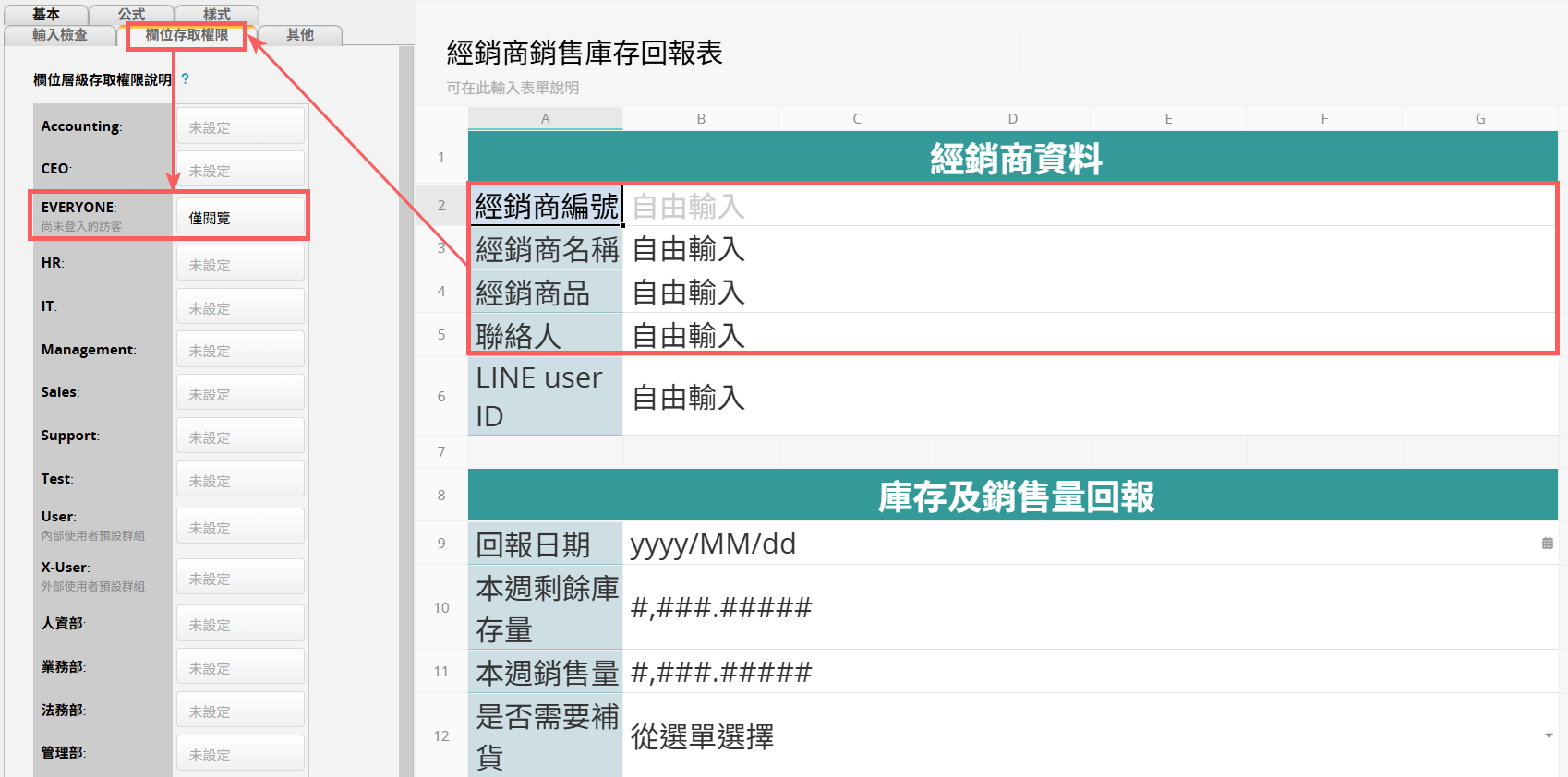 (2) 为了避免经销商误改预填数据,可以将“经销商编号、名称、经销商品、联络人”的 Everyone 的字段层级访问权限改为“仅阅览”。