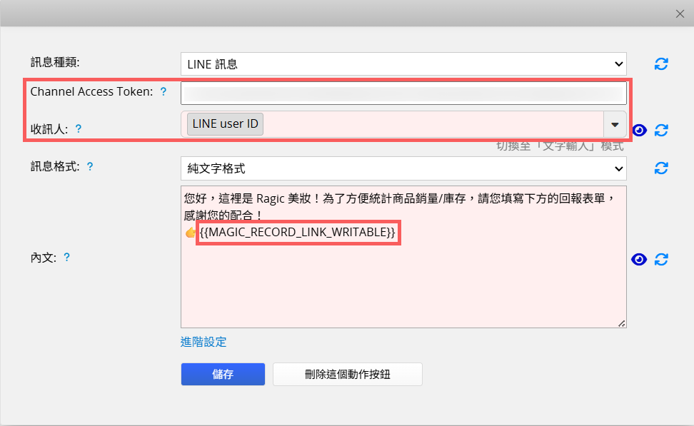为了让 Ragic 能够用 LINE 送出信息,你需要提供 LINE 官方帐号的 Channel access token,以及传送对象的 LINE user ID。(你可以参阅这篇文章,了解如何获取你的 Channel access token。)由于我们已经在这张表单上记录了经销商的 user ID,因此“收讯人”只要选择“LINE user ID”这个字段即可: