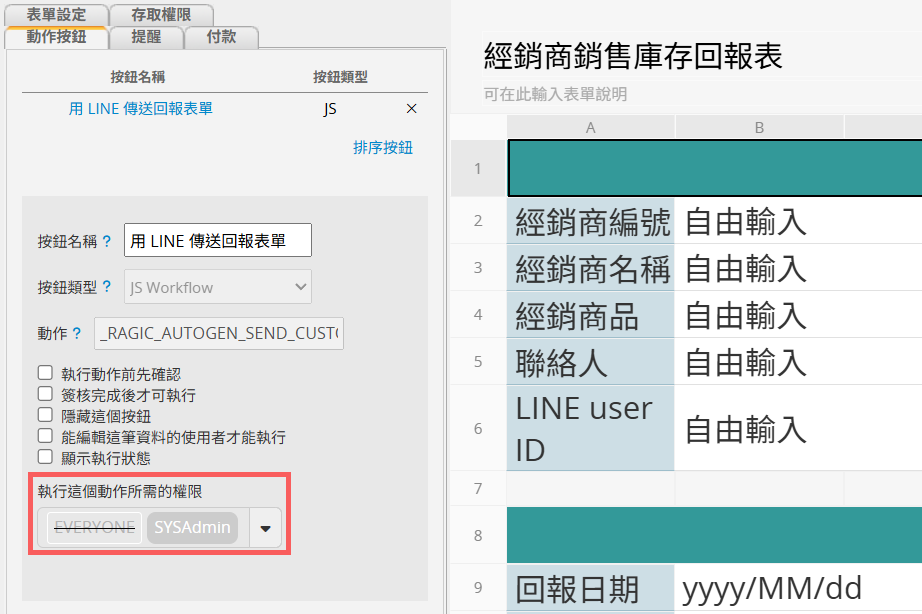 (4) 创建好单击钮后,可在左侧“表单设置 > 动作单击钮”里,点选该单击钮并撤销 Everyone 的使用权限,避免经销商填表时看到这个单击钮。