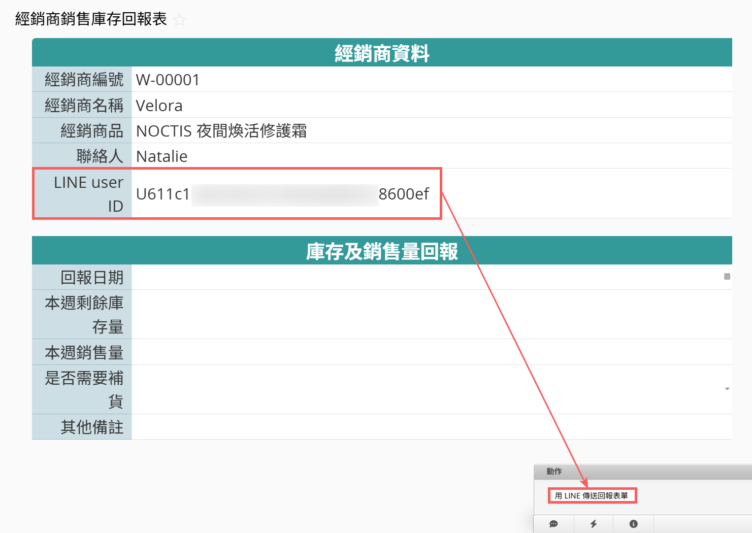 (5) 设置完成后,只要表单中输入了经销商的 LINE user ID,就能单击下“用 LINE 传送回报表单”单击钮,一键传送回报表单给经销商。