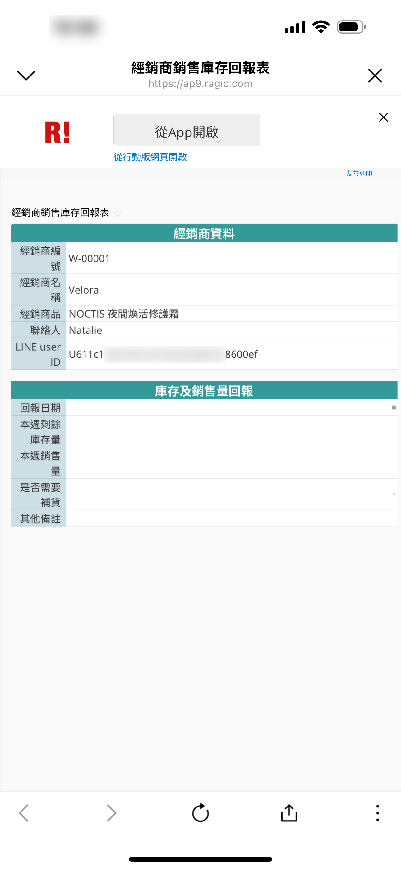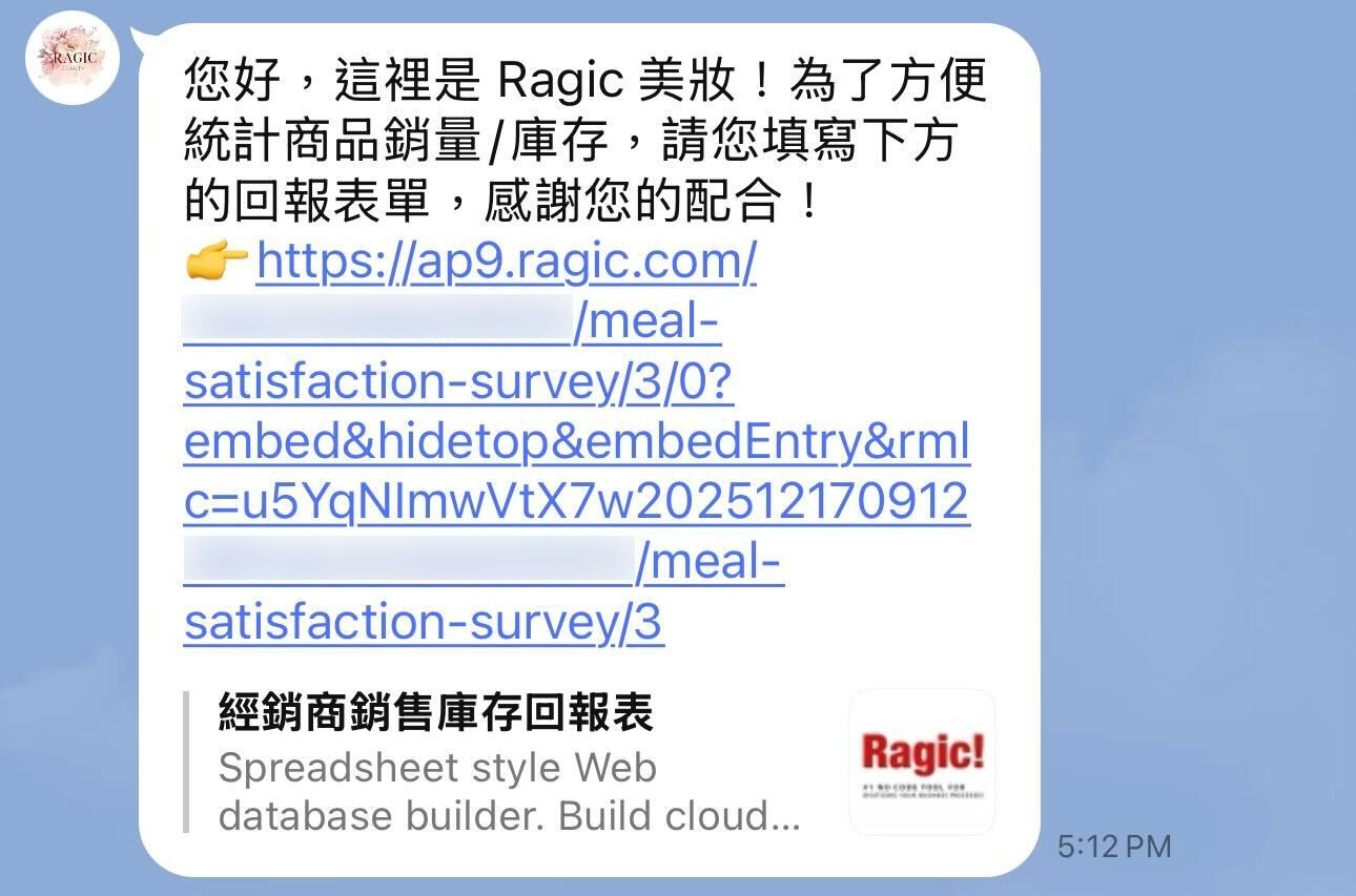 如果公司习惯透过 LINE 请经销商回报销售量或库存,其实也能用 Ragic 的传送实时信息功能,一键把“专属预填字段的回报表单”直接送到对方的 LINE。以下演示整体的设置流程。