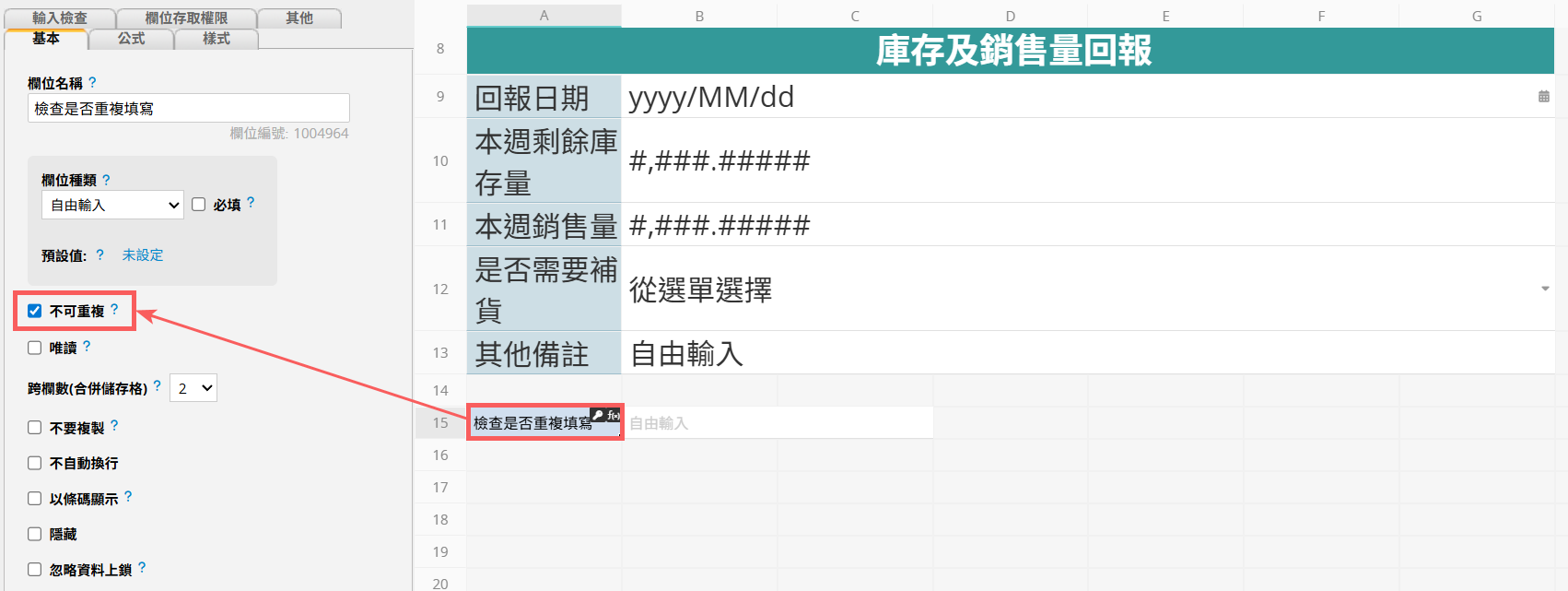 (2) 再来要将字段设为不可重复,避免同一位经销商重复输入同一天的回报数据。设置完成后,可将这个字段的 everyone 的字段访问权限设置为“无权限”,避免经销商看到或修改它。