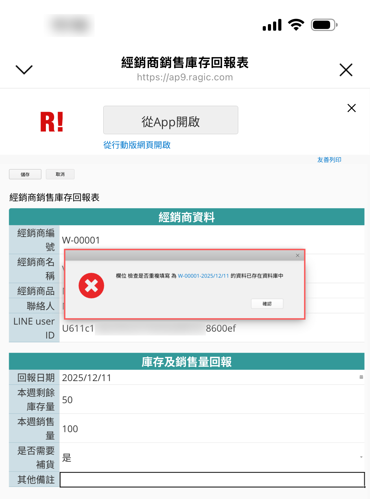 (3) 设置完成后,如果经销商在回报表单上重复填写了同一回报日期,系统就会退出警示信息,提醒他们避免重复填写。