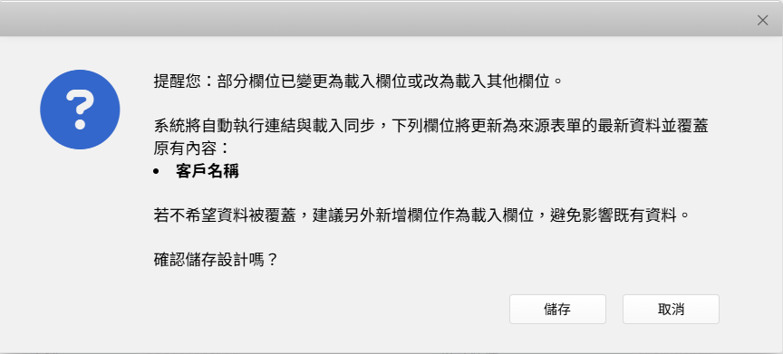 举例来说,在 A 表单 的 A 字段中,原本是从 B 表单 的 B 字段加载数据,若将加载字段改为 B 表单 的 C 字段,系统会自动重新同步,将既有记录中 A 字段的内容更新为 C 字段的值。