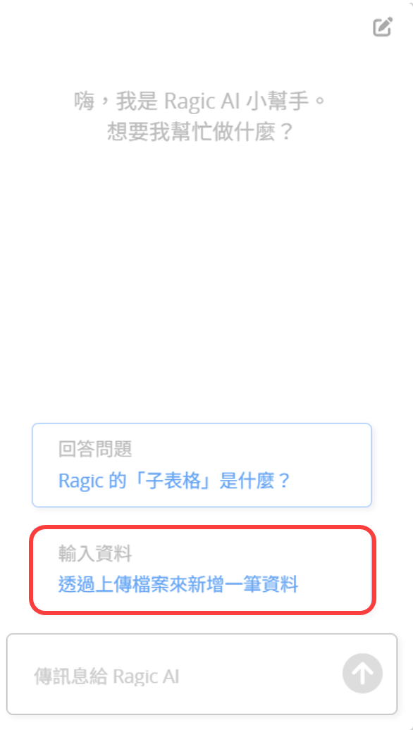 进入想要创建数据的表单后,点击 Ragic AI 的“输入数据”,即可上载一笔文件来新增数据。支持的文件格式包括 PDF、Excel、Word,以及图檔(JPG、PNG、GIF)。