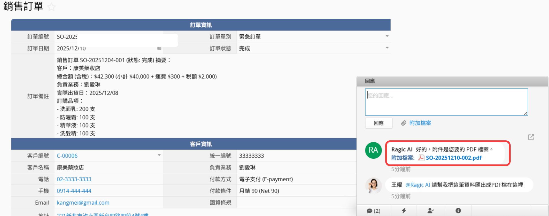 Ragic AI 能协助将数据汇出为 PDF 或 Excel,并寄送至指定的电邮地址或记录中的电邮字段,或是直接将文件上载为响应工具中的附件。