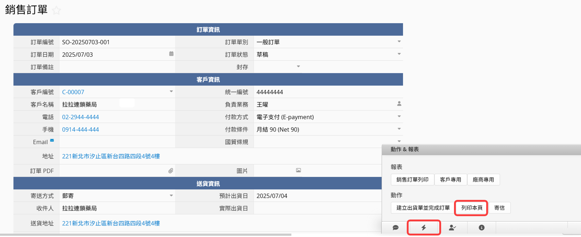 保存后,单击钮会显示在表单页的右下方(点击闪电图符)。