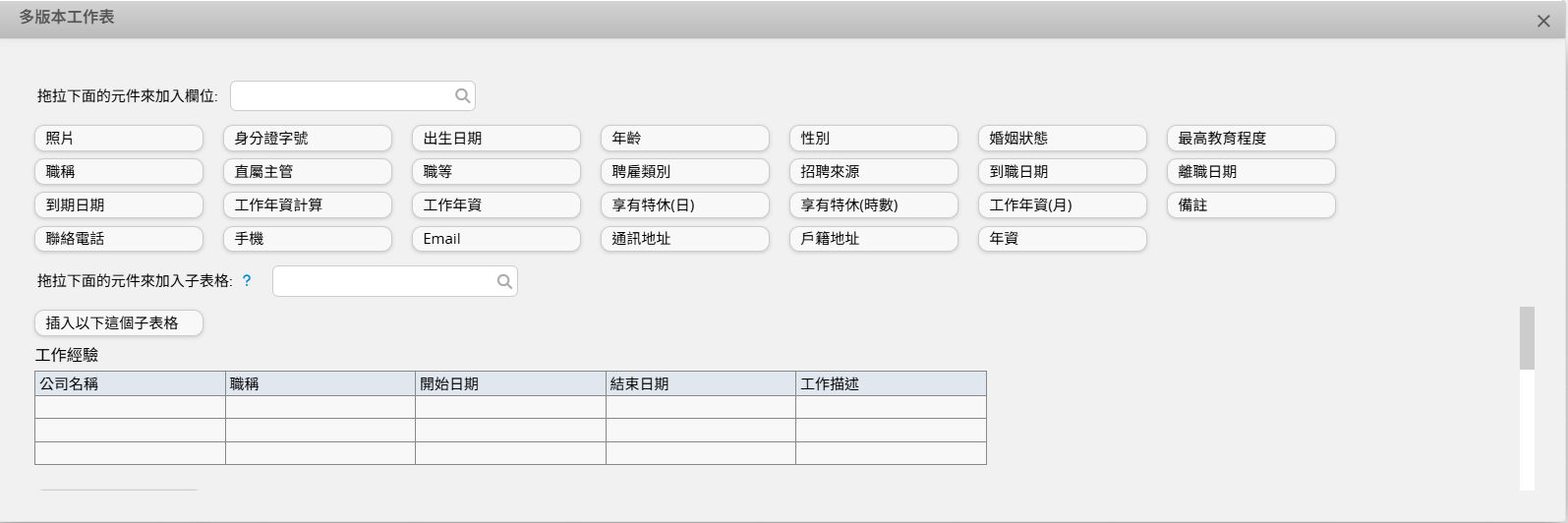 如果想要手动将新字段或子表格加到其他多版本表单,先进入要新增此字段或子表格的表单设计模式,点选 表单工具从链接工作表的多版本工作表下会看到其他版本的表单,点击已新增字段或子表格的表单。