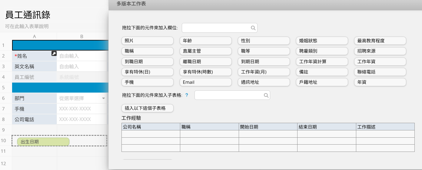如果希望同一笔数据不同权限的人可以看到的内容不同,像是“人事数据表”跟“员工通信录”可能共享部分相同的数据,如:员工姓名、职称、联络方式等,想让全公司的人员都可以看到彼此的基本数据;而人事数据表还包含员工的隐私数据,例如:地址、年龄、工作经历等,不适合公开给所有员工检阅,但重复在两张表单创建数据又很费工,这时就可以透过多版本表单省去两边管理的麻烦。透过创建不同版本的表单但共享数据,来让不同用户群组看到不同版本的表单字段。
