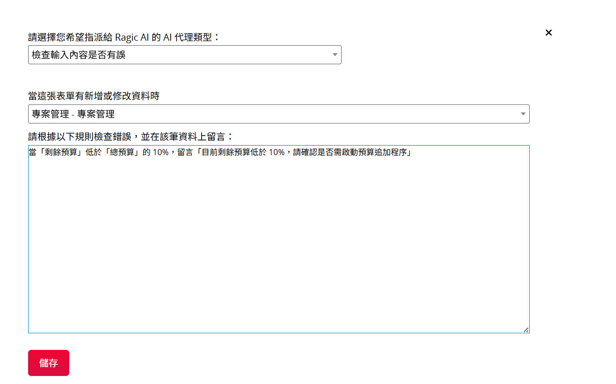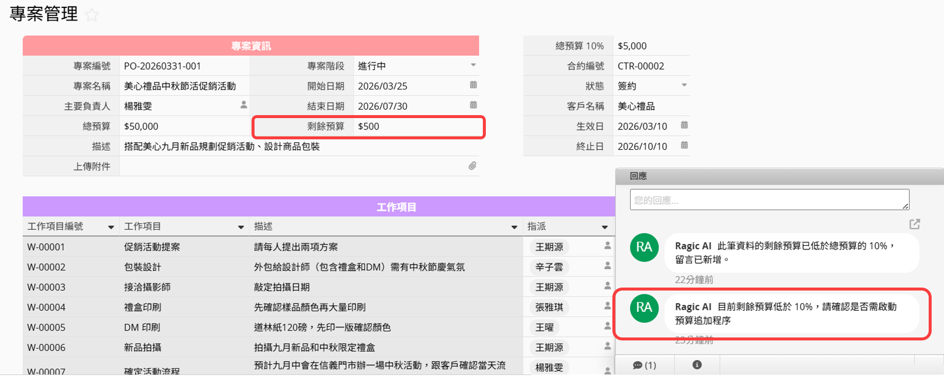 保存后,当“剩余预算”低于“总预算”的 10%,Ragic AI 会自动留言提醒。