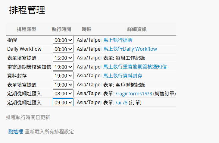 你可以针对以下功能设置运行时间的排程:提醒、重寄逾期签核通知信、数据封存、表单填写提醒、定期从网址汇入、SQL 数据库同步、每日运行的程序(Daily Workflow)及定期寄出报表,默认是根据帐号设置中的默认排程运行时间。请注意各功能本身的设置还是回到该功能对应的接口调整。
