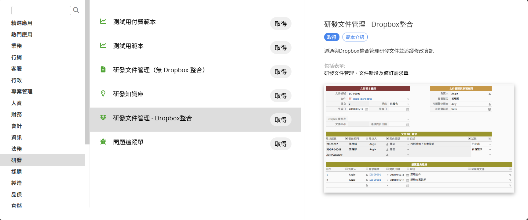 若已經是 Ragic 用戶,可以在應用商店的「研發」類別中找到「研發文件管理 - Dropbox 整合」模組並點擊「取得」來下載。