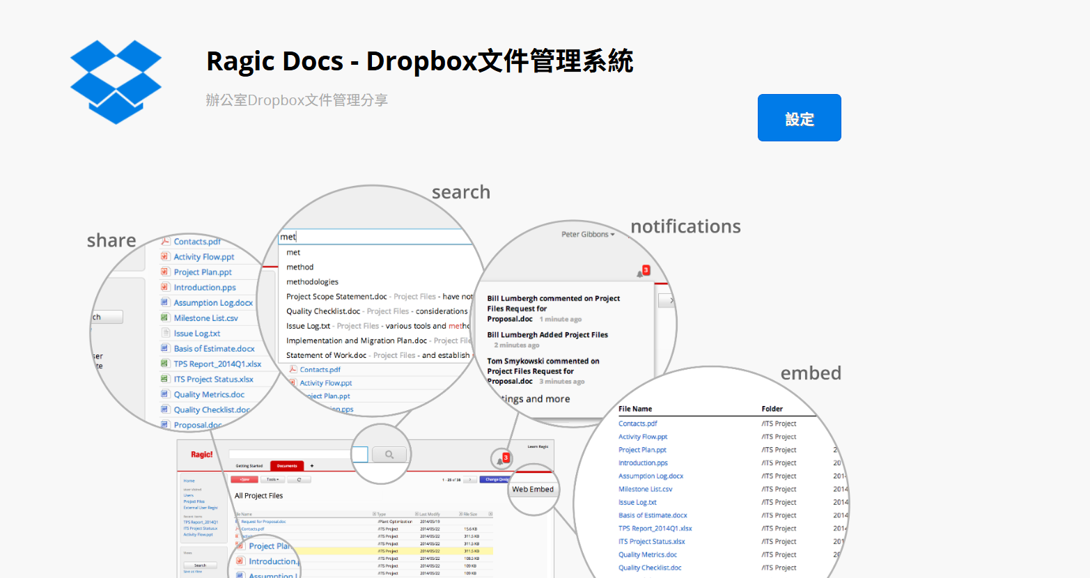 「RagicDocs」能把你的 Dropbox 資料夾變成文件分享平台,你只需要把該資料夾連結到「RagicDocs」表單就能夠立即上線。
