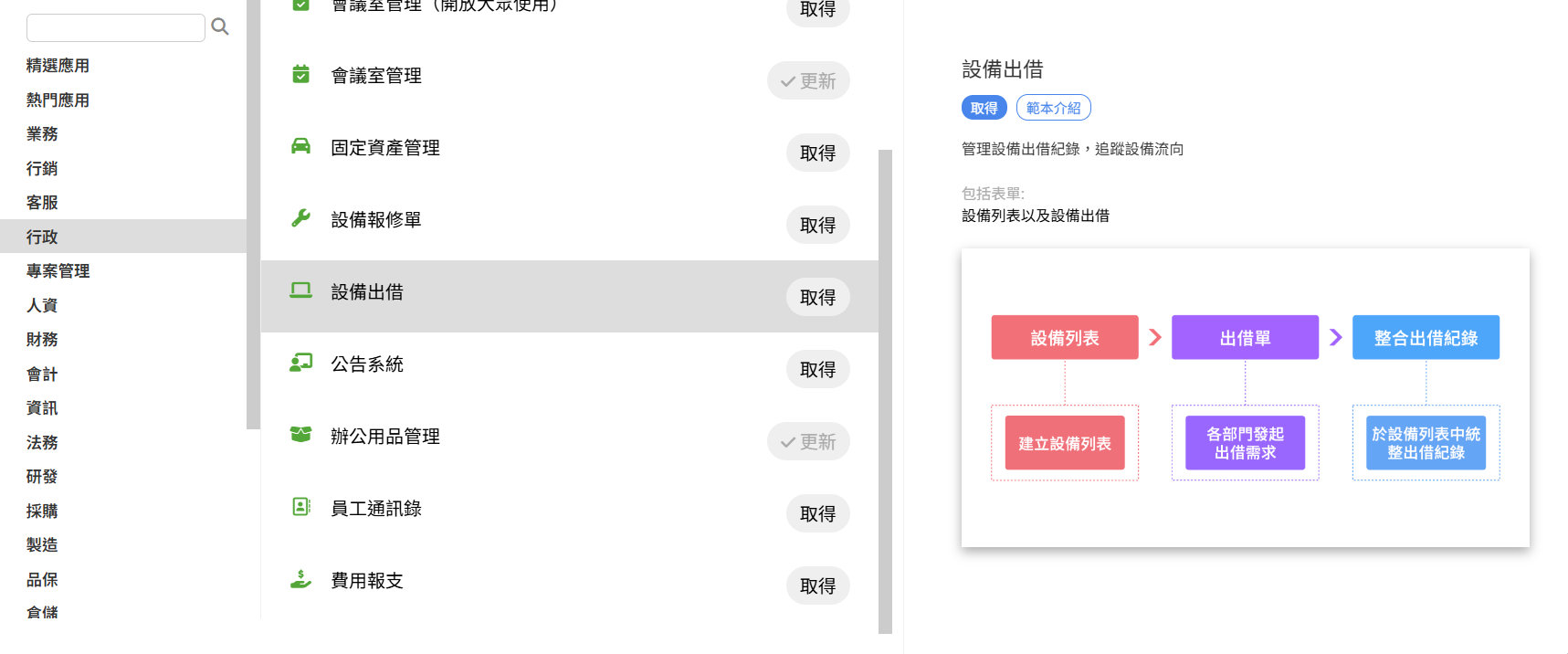 如果已經擁有帳號的朋友,可以在開始頁籤下的應用商店中,選擇「行政」中的「設備出借」模組來下載使用。