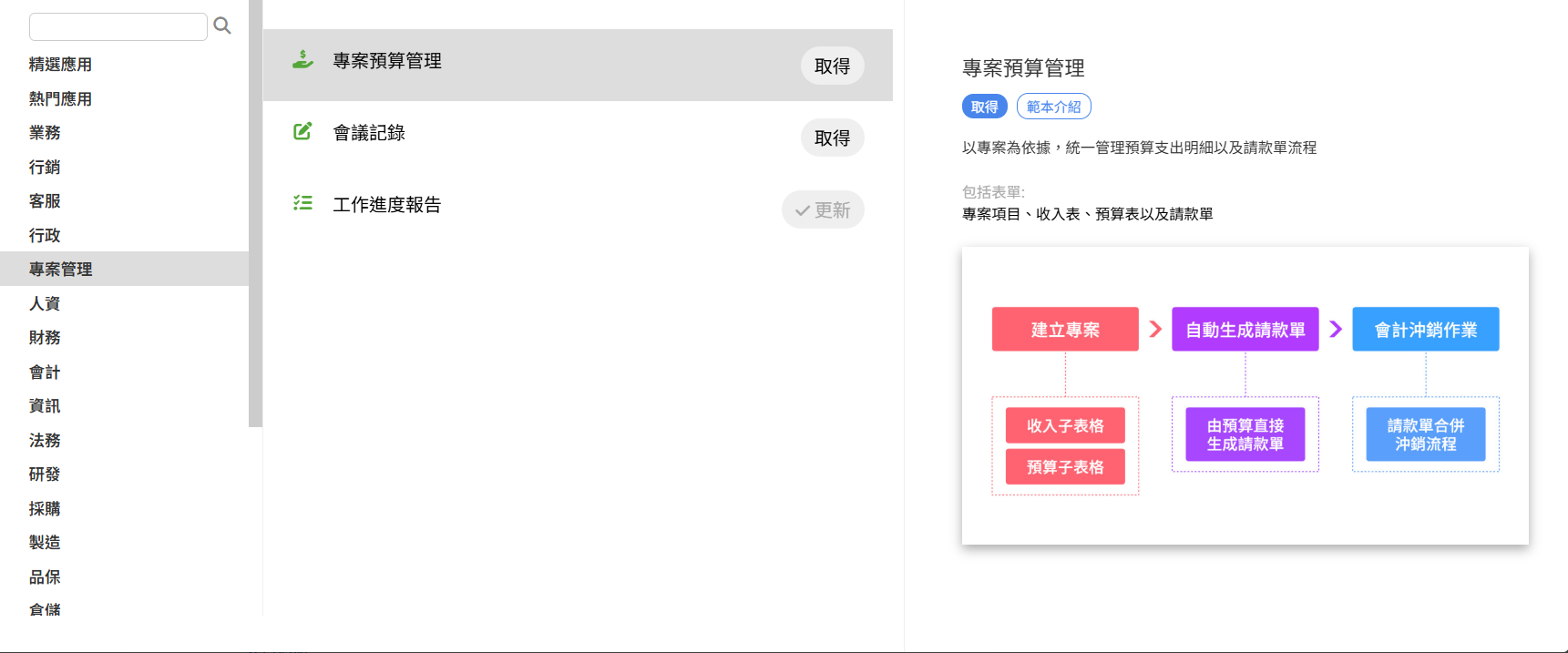 若已經是 Ragic 用戶,可以在應用商店的「專業管理」類別中找到「專案預算管理」模組並點擊「取得」來下載。