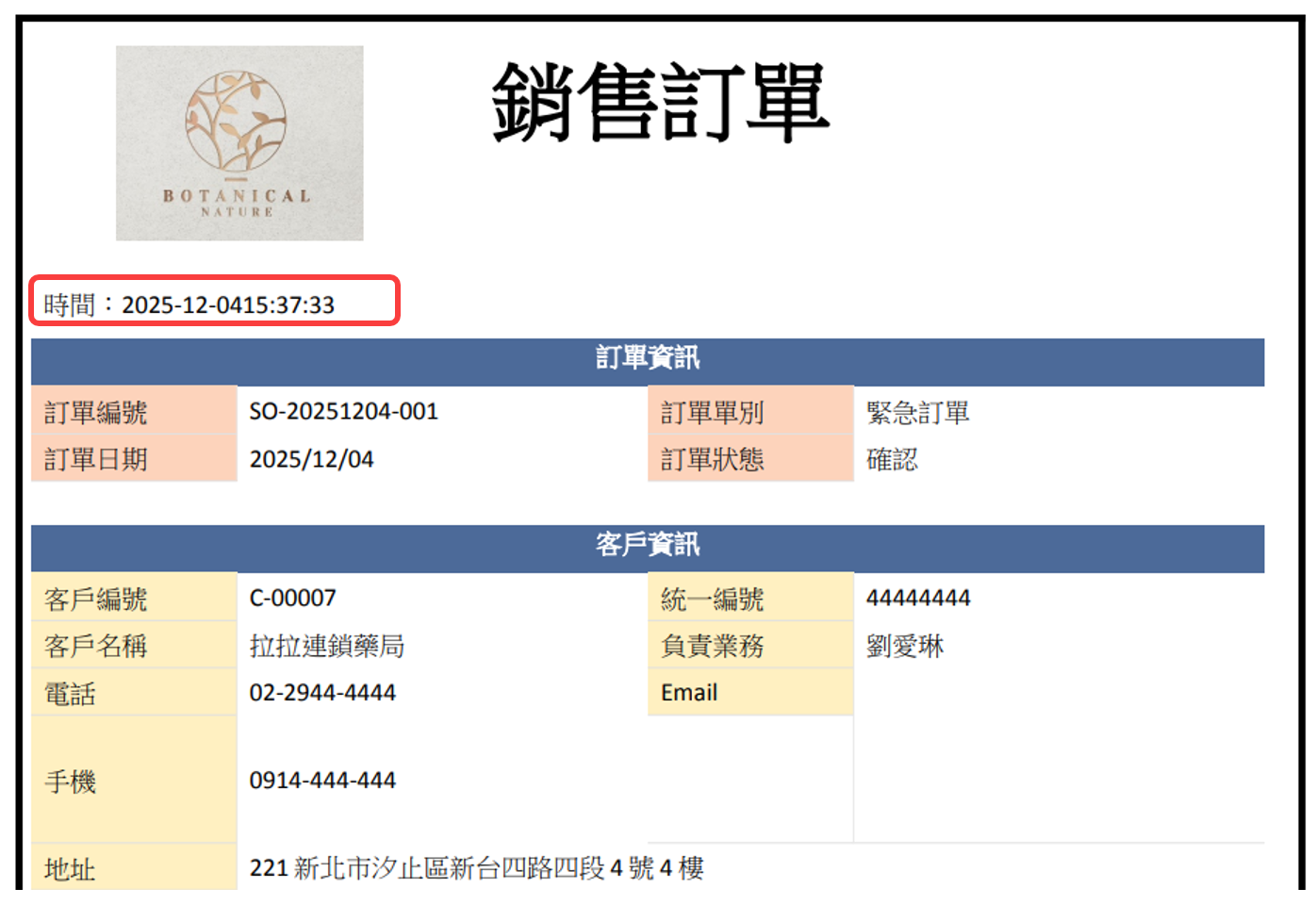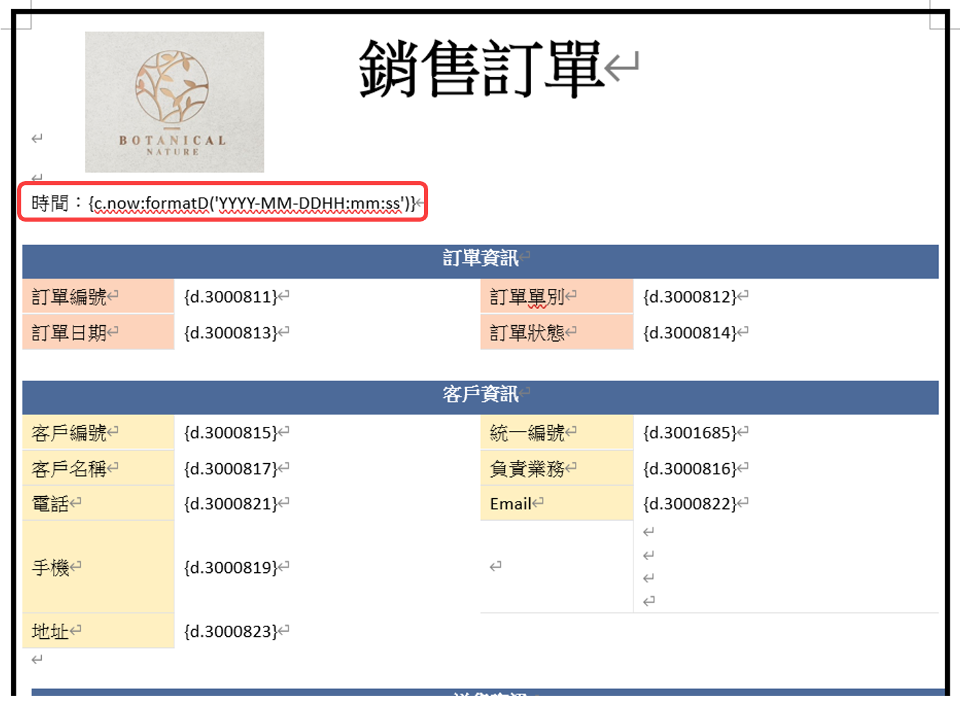 若希望在列印的檔案中顯示輸出當下的日期與時間,可在範本中加入以下參數: {c.now:formatD('YYYY-MM-DD HH:mm:ss')} 。