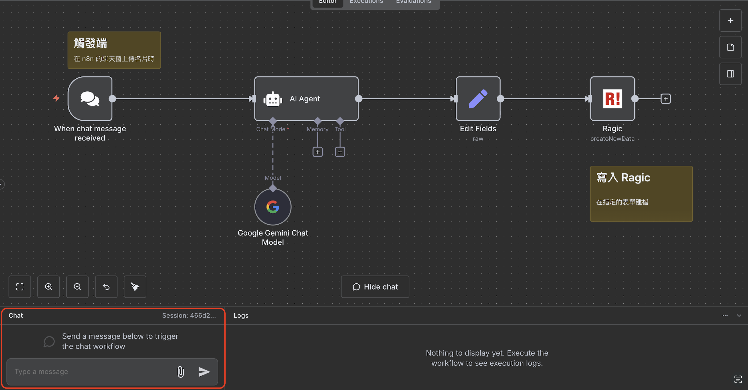 完成以上設定後,請先點開 n8n 左下角中的 「Chat」,附上文字說明與圖片,送出後才會先觸發 AI Agent,才能進行後續步驟 4 的設定。