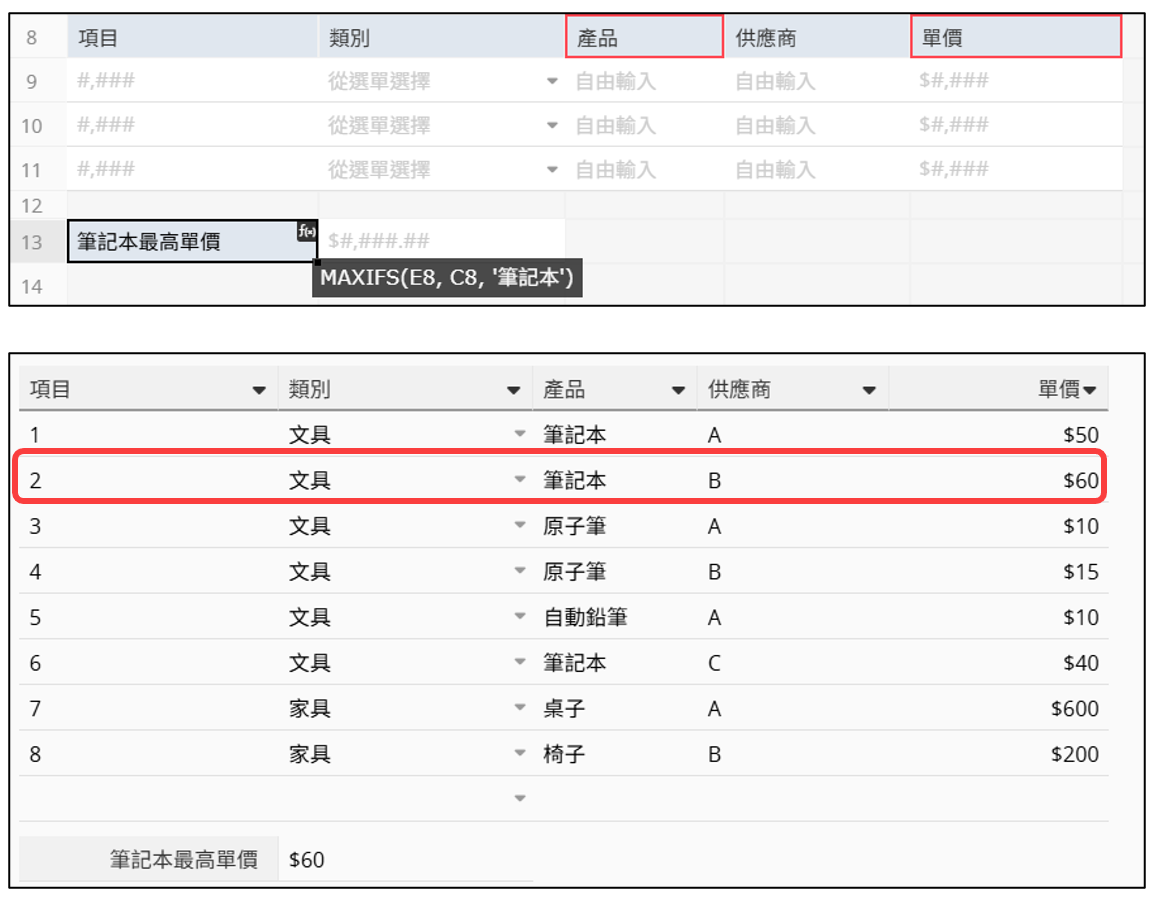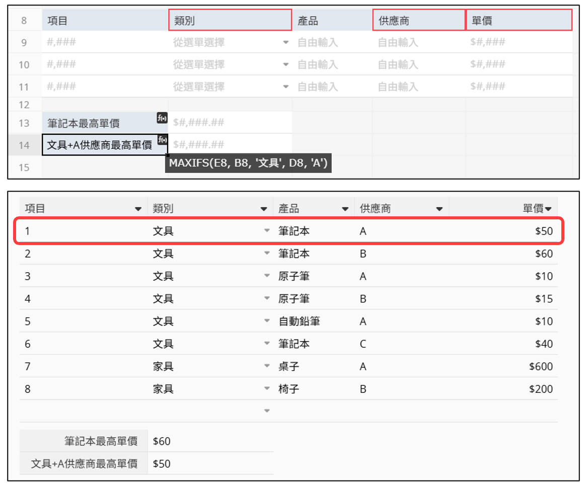 若要找出類別為「文具」且供應商為「A 供應商」的最高單價,可輸入:MAXIFS(「單價」欄位, 「類別」欄位, "文具", 「供應商」, "A")。