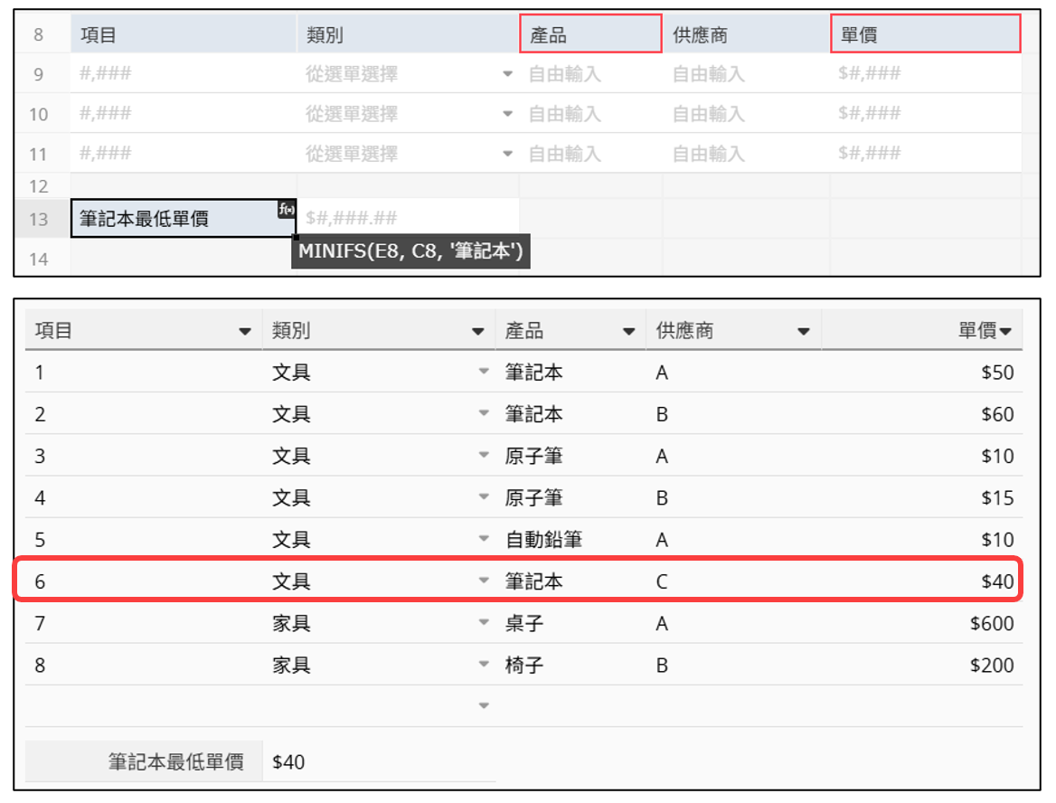 在報價紀錄表中,若要查詢「筆記本」的最低單價,可輸入:MINIFS(「單價」欄位, 「品項」欄位, "筆記本")。