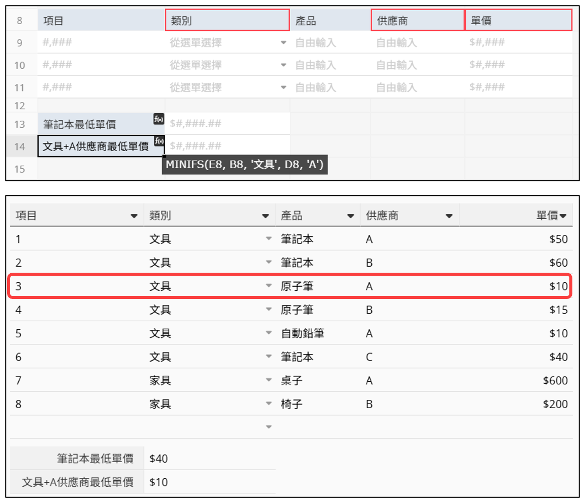 若要找出類別為「文具」且供應商為「A 供應商」的最低單價,可輸入:MINIFS(「單價」欄位, 「類別」欄位, "文具", 「供應商」, "A")。