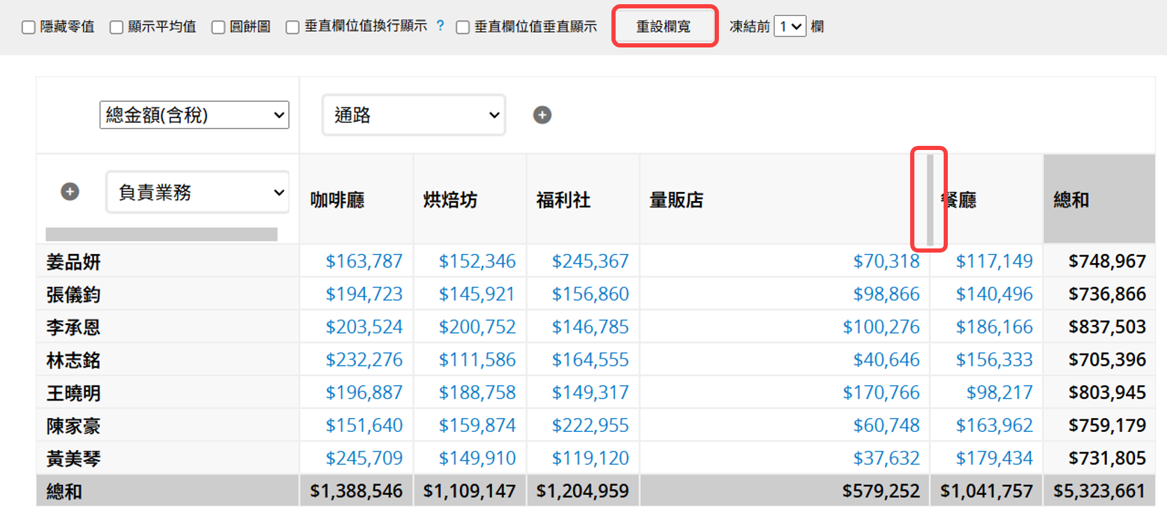 可以拖曳欄位邊框來調整欄寬,以及點擊上方的重設欄寬來恢復預設設定。