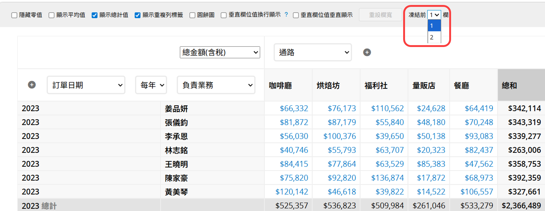 當水平項目有設定多組時可以在上方選擇要凍結前幾欄,以便查看報表。